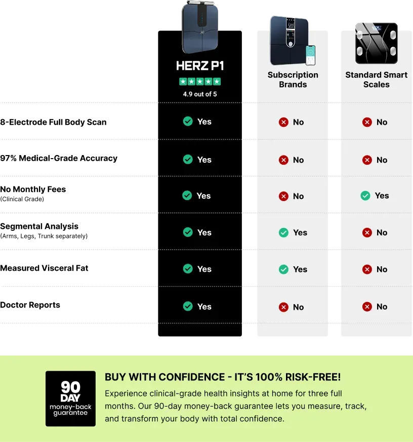 Very accurate. The Herz P1 uses the same 8-electrode dual-frequency BIA technology found in professional clinics. Our testing shows a 97% correlation with professional InBody devices used in hospitals and gyms.